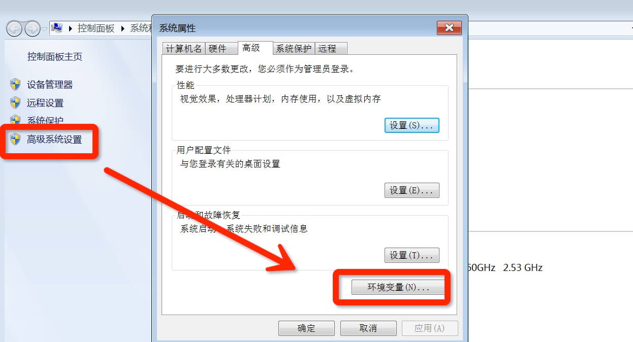 右击我的电脑,单击"属性",进入如图所示页面。下面开始配置环境变量,右击【我的电脑】--【属性】--【高级系统设置】--【环境变量】,如图: