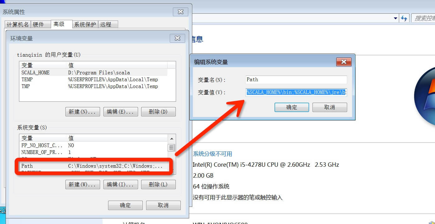 设置 Path 变量:找到系统变量下的"Path"如图,单击编辑。在"变量值"一栏的最前面添加如下的路径: %SCALA_HOME%\bin;%SCALA_HOME%\jre\bin;