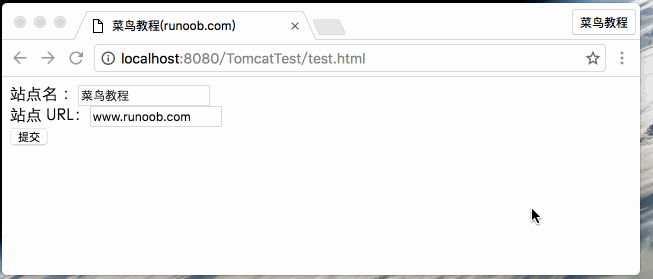 <!DOCTYPE html> <html> <head> <meta charset="utf-8"> <title>菜鸟教程(runoob.com)</title> </head> <body> <form action="/TomcatTest/HelloForm" method="GET"> 站点名 :<input type="text" name="name"> <br /> 站点 URL:<input type="text" name="url" /><br> <input type="submit" value="提交" /> </form> </body> </html>