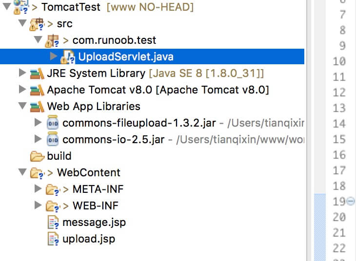 以下是 UploadServlet 的源代码,同于处理文件上传,在这之前我们先确保依赖包已经引入到项目的 WEB-INF/lib 目录下:
