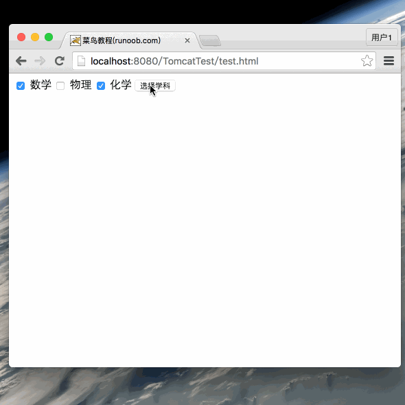 <!DOCTYPE html> <html> <head> <meta charset="utf-8"> <title>菜鸟教程(runoob.com)</title> </head> <body> <form action="ReadParams" method="POST" target="_blank"> <input type="checkbox" name="maths" checked="checked" /> 数学 <input type="checkbox" name="physics" /> 物理 <input type="checkbox" name="chemistry" checked="checked" /> 化学 <input type="submit" value="选择学科" /> </form> </body> </html>