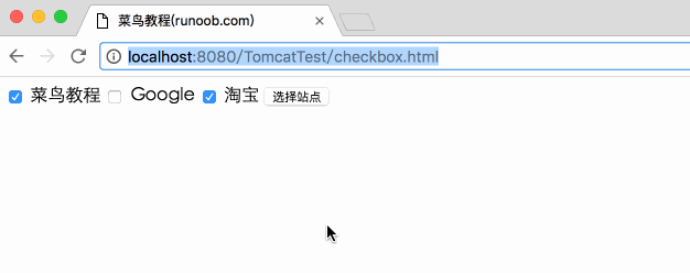 <!DOCTYPE html> <html> <head> <meta charset="utf-8"> <title>菜鸟教程(runoob.com)</title> </head> <body> <form action="CheckBox" method="POST" target="_blank"> <input type="checkbox" name="runoob" checked="checked" /> 菜鸟教程 <input type="checkbox" name="google" /> Google <input type="checkbox" name="taobao" checked="checked" /> 淘宝 <input type="submit" value="选择站点" /> </form> </body> </html>