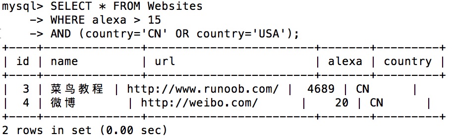 +----+--------------+---------------------------+-------+---------+ | id | name | url | alexa | country | +----+--------------+---------------------------+-------+---------+ | 1 | Google | https://www.google.cm/ | 1 | USA | | 2 | 淘宝 | https://www.taobao.com/ | 13 | CN | | 3 | 菜鸟教程 | http://www.runoob.com/ | 4689 | CN | | 4 | 微博 | http://weibo.com/ | 20 | CN | | 5 | Facebook | https://www.facebook.com/ | 3 | USA | +----+--------------+---------------------------+-------+---------+