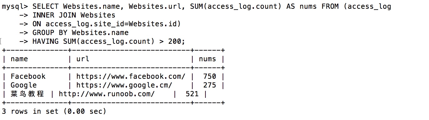 +----+--------------+---------------------------+-------+---------+ | id | name | url | alexa | country | +----+--------------+---------------------------+-------+---------+ | 1 | Google | https://www.google.cm/ | 1 | USA | | 2 | 淘宝 | https://www.taobao.com/ | 13 | CN | | 3 | 菜鸟教程 | http://www.runoob.com/ | 4689 | CN | | 4 | 微博 | http://weibo.com/ | 20 | CN | | 5 | Facebook | https://www.facebook.com/ | 3 | USA | | 7 | stackoverflow | http://stackoverflow.com/ | 0 | IND | +----+---------------+---------------------------+-------+---------+