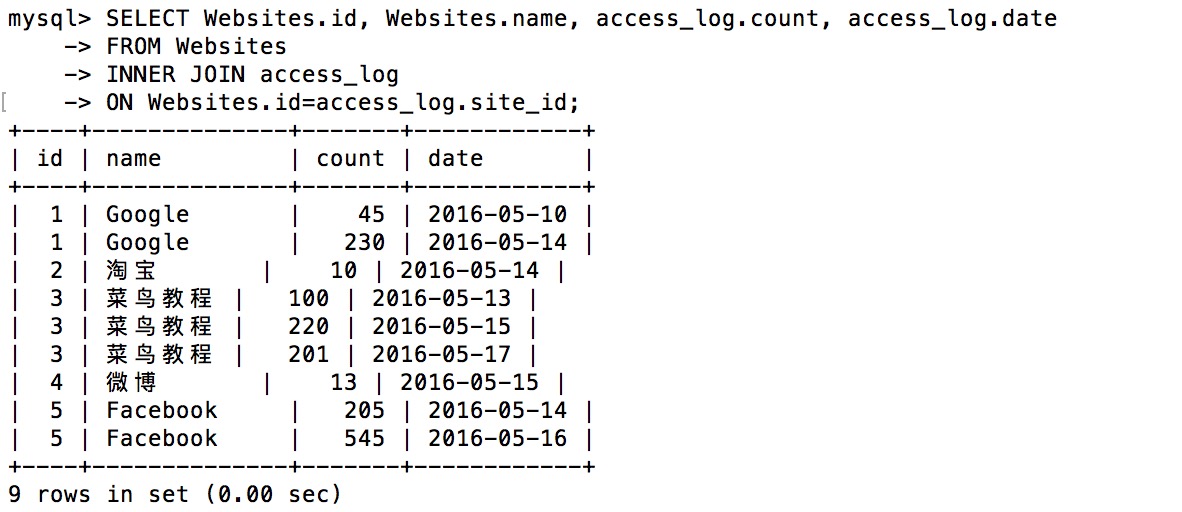 请注意,"Websites" 表中的 "id" 列指向 "access_log" 表中的字段 "site_id"。上面这两个表是通过 "site_id" 列联系起来的。