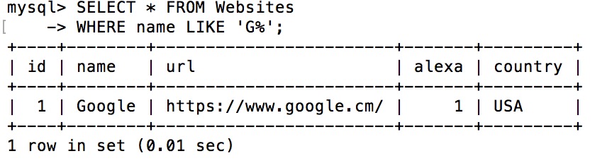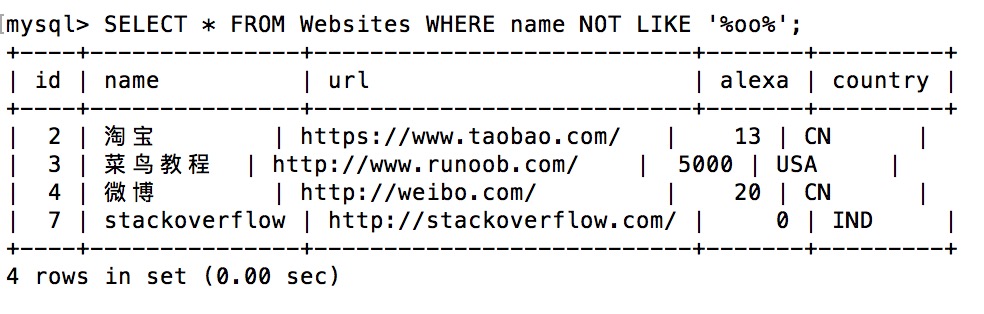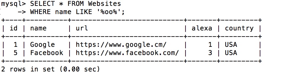 mysql> SELECT * FROM Websites; +----+---------------+---------------------------+-------+---------+ | id | name | url | alexa | country | +----+---------------+---------------------------+-------+---------+ | 1 | Google | https://www.google.cm/ | 1 | USA | | 2 | 淘宝 | https://www.taobao.com/ | 13 | CN | | 3 | 菜鸟教程 | http://www.runoob.com/ | 5000 | USA | | 4 | 微博 | http://weibo.com/ | 20 | CN | | 5 | Facebook | https://www.facebook.com/ | 3 | USA | | 7 | stackoverflow | http://stackoverflow.com/ | 0 | IND | +----+---------------+---------------------------+-------+---------+