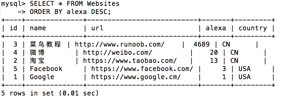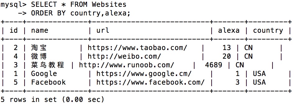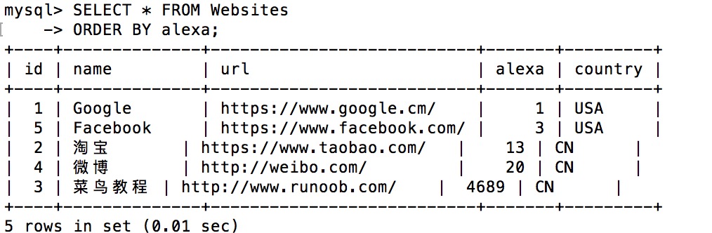 +----+--------------+---------------------------+-------+---------+ | id | name | url | alexa | country | +----+--------------+---------------------------+-------+---------+ | 1 | Google | https://www.google.cm/ | 1 | USA | | 2 | 淘宝 | https://www.taobao.com/ | 13 | CN | | 3 | 菜鸟教程 | http://www.runoob.com/ | 4689 | CN | | 4 | 微博 | http://weibo.com/ | 20 | CN | | 5 | Facebook | https://www.facebook.com/ | 3 | USA | +----+--------------+---------------------------+-------+---------+