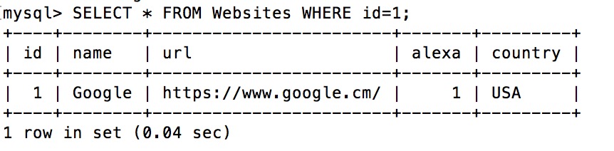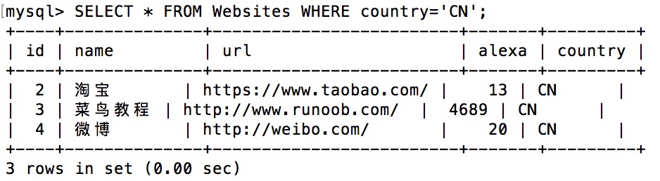 +----+--------------+---------------------------+-------+---------+ | id | name | url | alexa | country | +----+--------------+---------------------------+-------+---------+ | 1 | Google | https://www.google.cm/ | 1 | USA | | 2 | 淘宝 | https://www.taobao.com/ | 13 | CN | | 3 | 菜鸟教程 | http://www.runoob.com/ | 4689 | CN | | 4 | 微博 | http://weibo.com/ | 20 | CN | | 5 | Facebook | https://www.facebook.com/ | 3 | USA | +----+--------------+---------------------------+-------+---------+