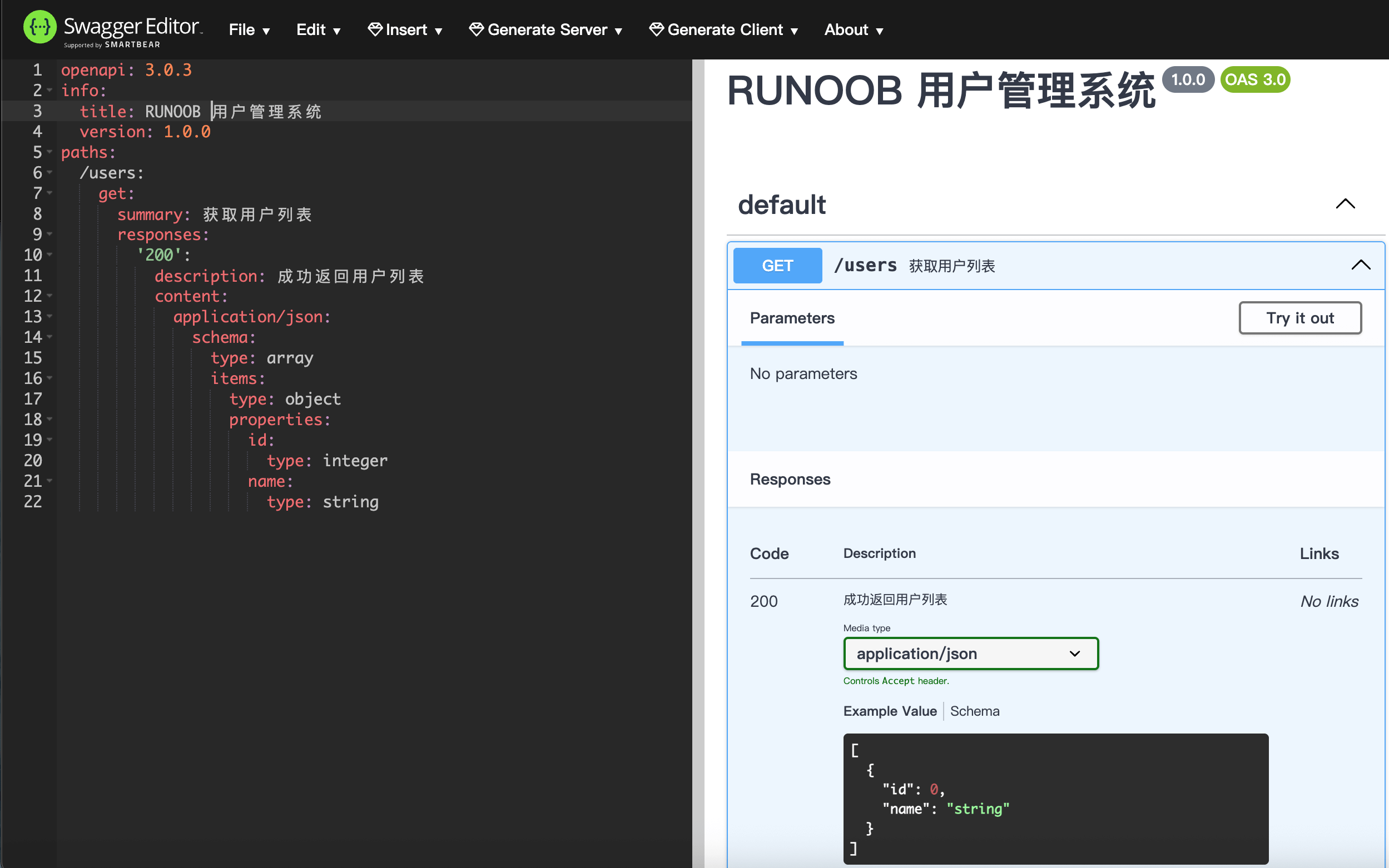 输入以下 YAML 代码(定义一个简单的 GET /users 接口):