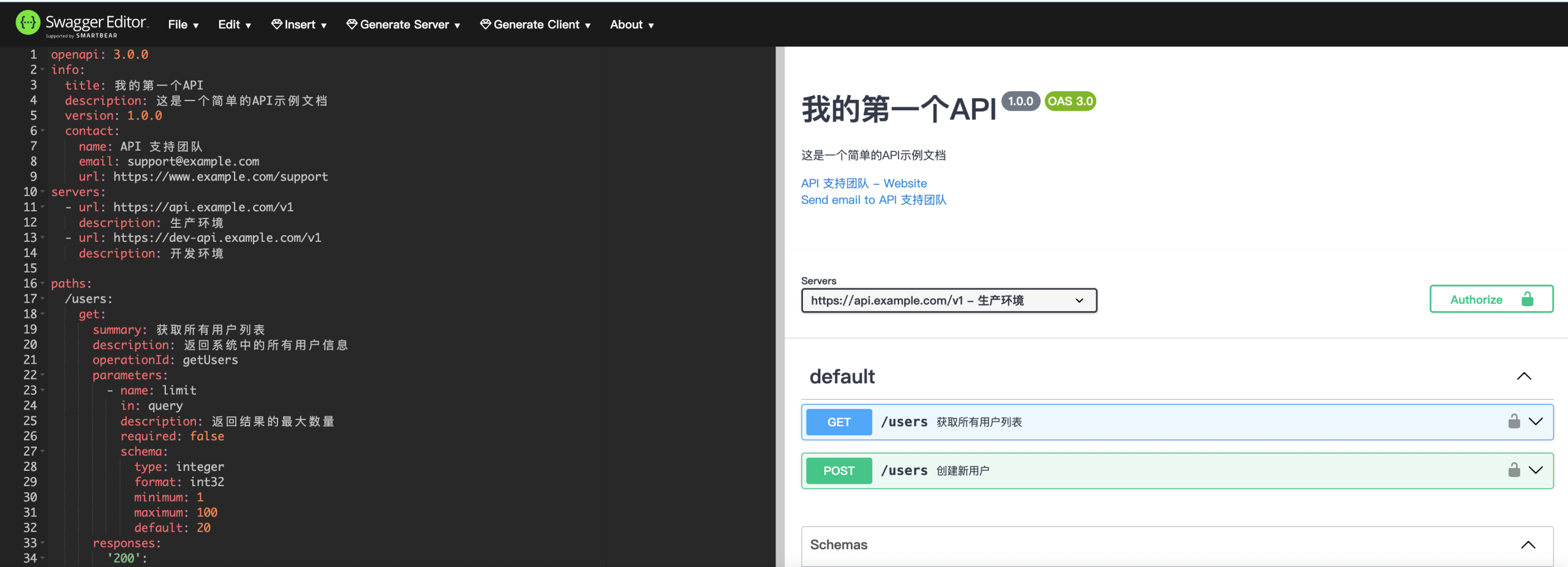 你可以使用 Swagger Editor 在线测试你的文档。只需将你的 YAML 或 JSON 复制粘贴到编辑器中,右侧面板将显示可视化的 API 文档。
