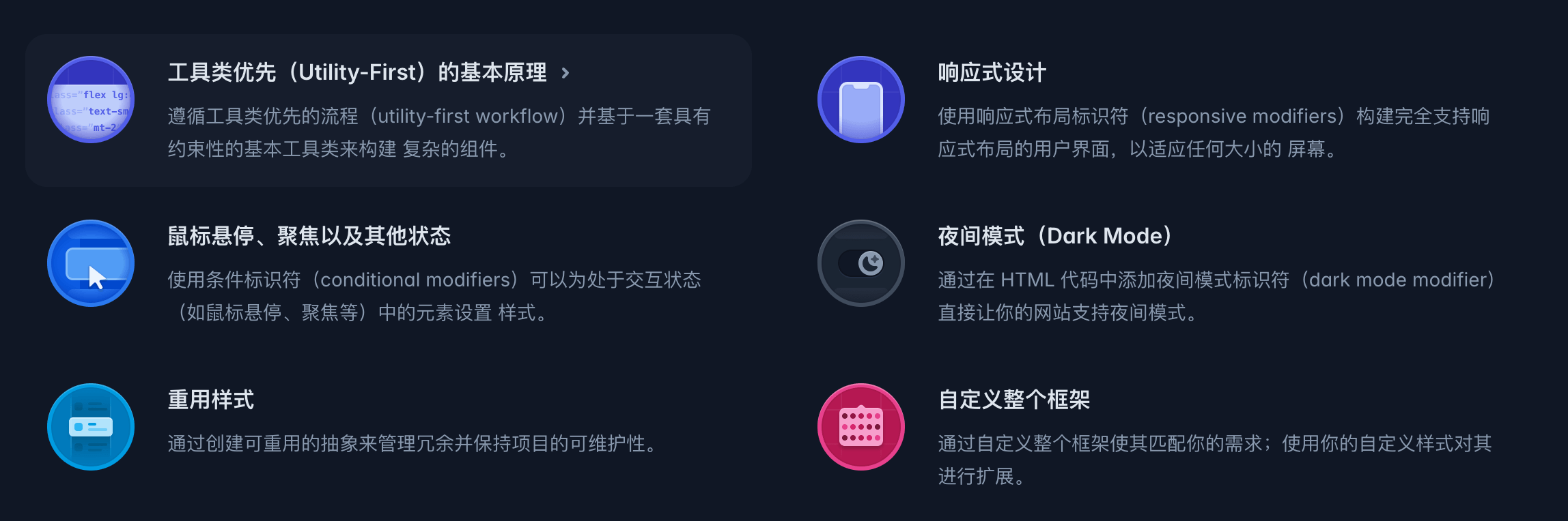 工具类优先(Utility-First):遵循工具类优先的流程,使用具有约束性的基本工具类来构建复杂的组件。