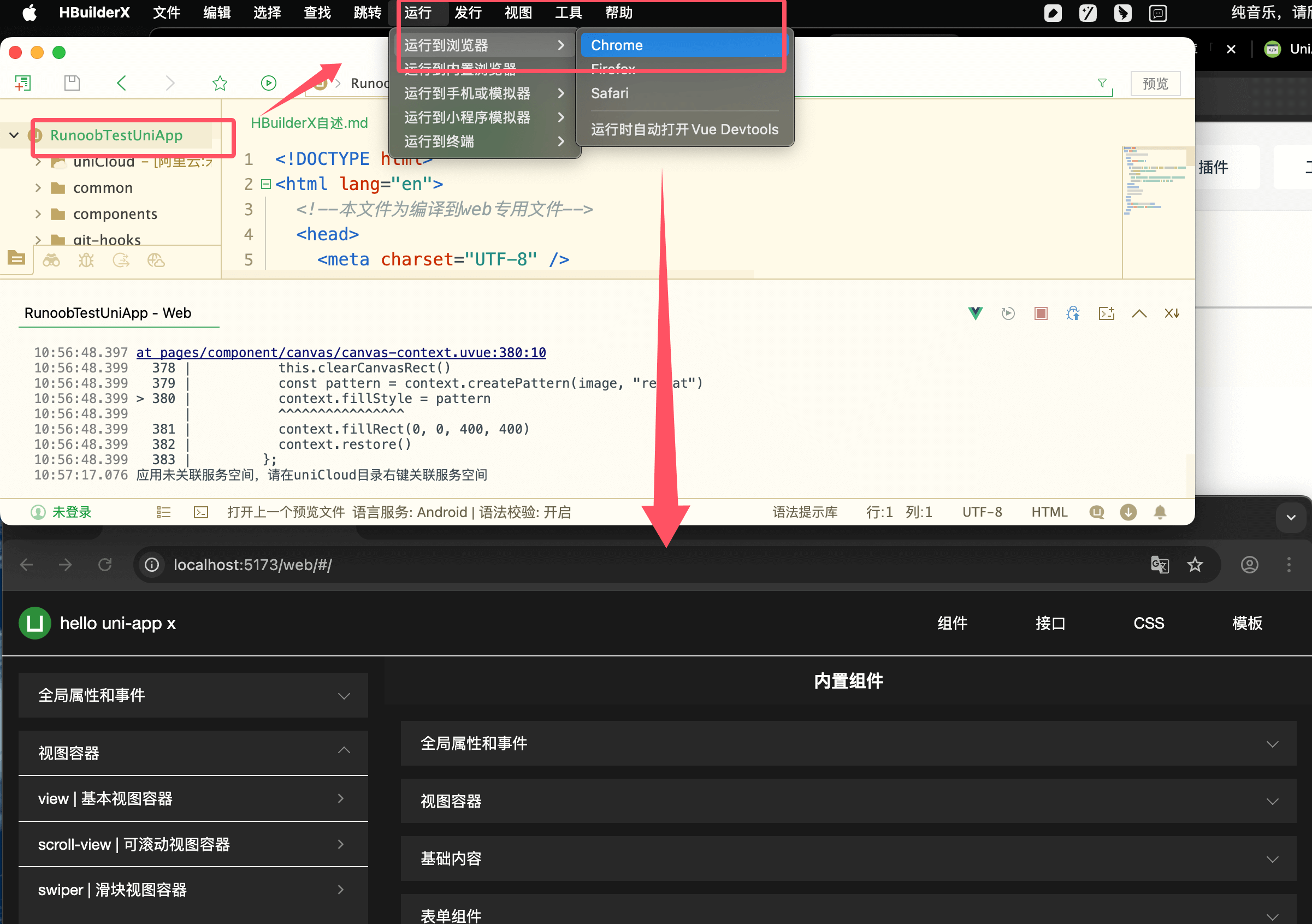 浏览器运行:进入项目,点击工具栏的运行 -> 运行到浏览器 -> 选择浏览器,选择 Chrome,也可以其他浏览器,即可体验 uni-app 的 web 版。