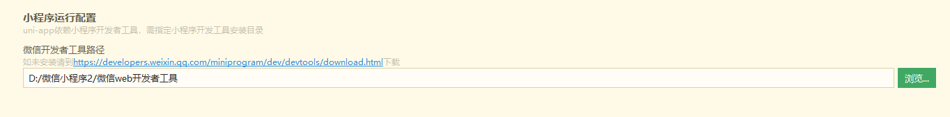注意:如果是第一次使用,需要先配置小程序 ide 的相关路径,才能运行成功。如下图,需在输入框输入微信开发者工具的安装路径。
