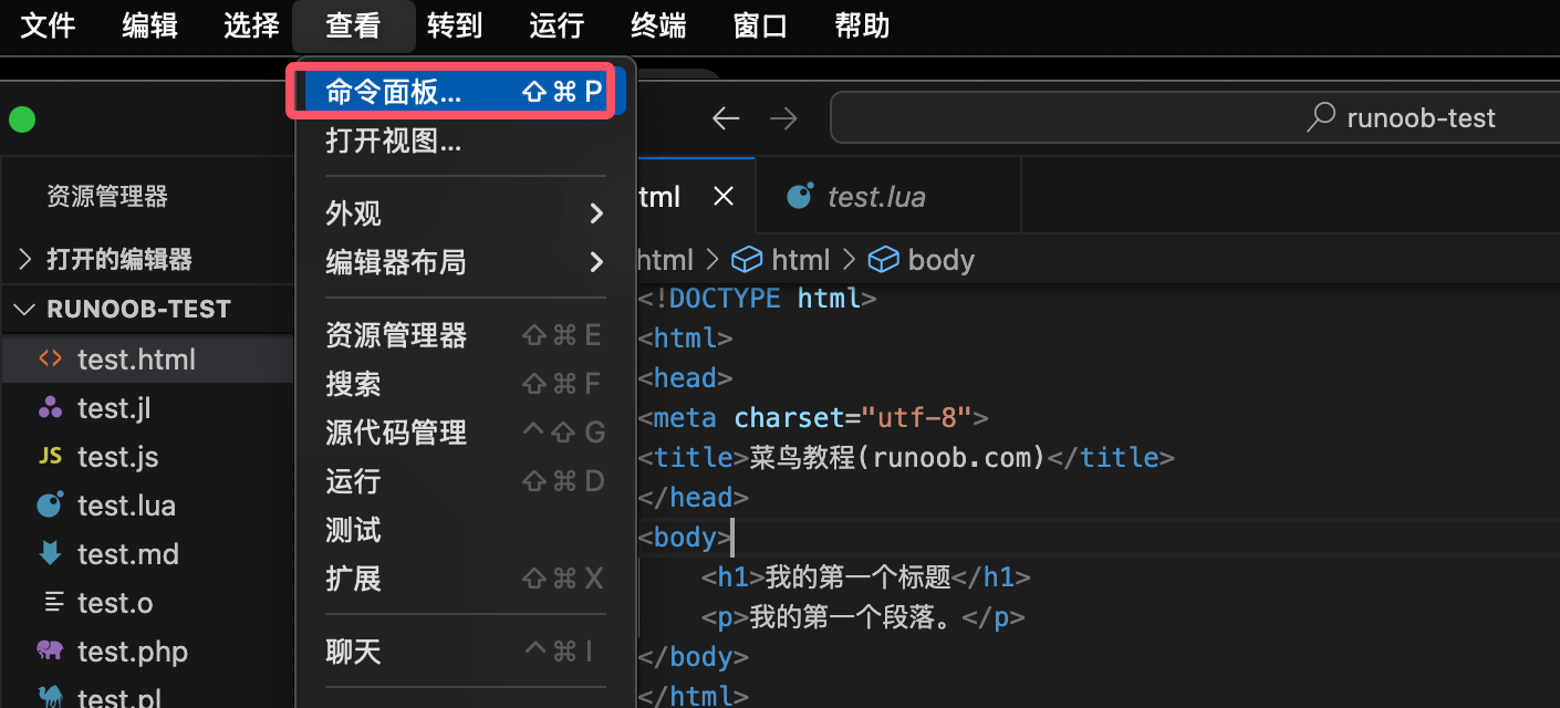 也可以通过菜单栏选择 查看(View) > 命令面板(Command Palette...) 打开。