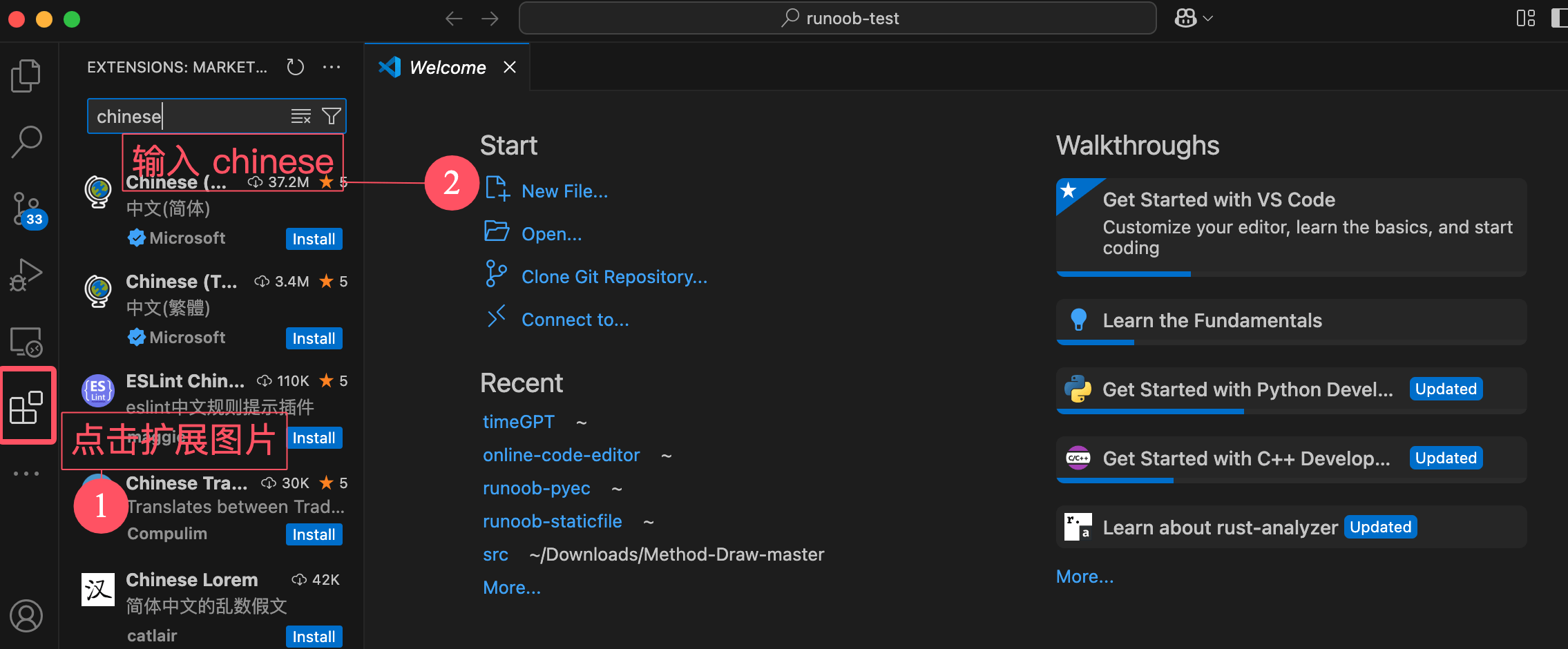VScode 安装汉化包很简单,打开 VScode,点击左侧安装扩展图标,在搜索框输入 Chinese: