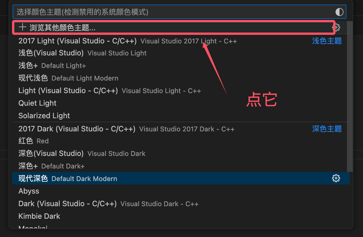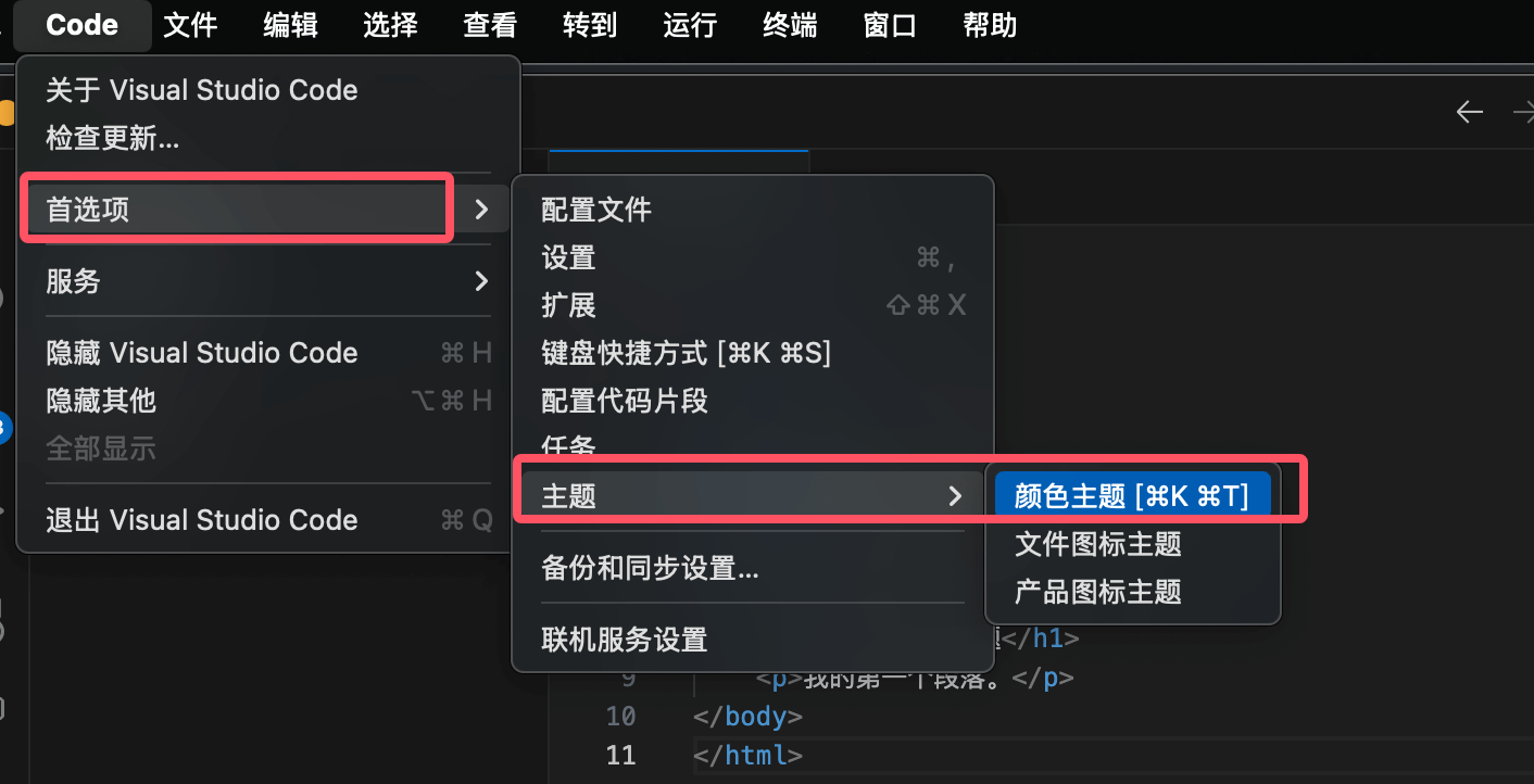 从菜单栏选择 Code > 设置(首选项) > 主题 > 颜色主题 菜单项:或使用命令 Preferences: Color Theme (⌘K ⌘T) 打开主题选择器。