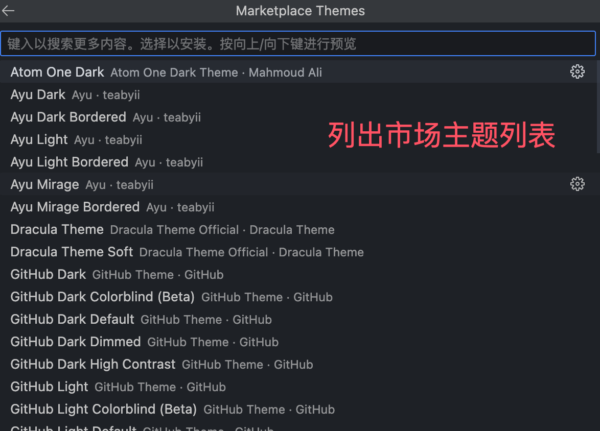 在颜色主题选择器中点击 流量其他颜色主题(Browse Additional Color Themes...) 选项,跳转到市场主题浏览页面: