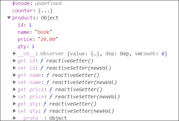 以上实例中我们使用 Vue.delete 来删除 price 属性。以下是控制台输出结果: