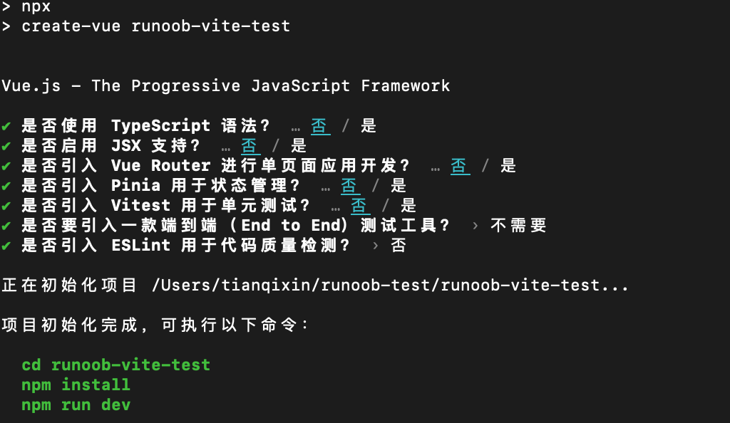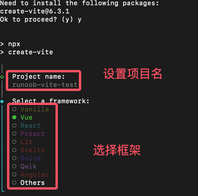 选择模板后,Vite 会自动创建项目目录并安装依赖,本章节我们选择了 Vue 框架。