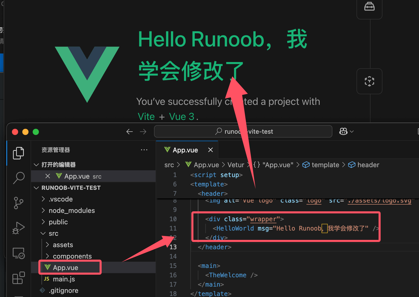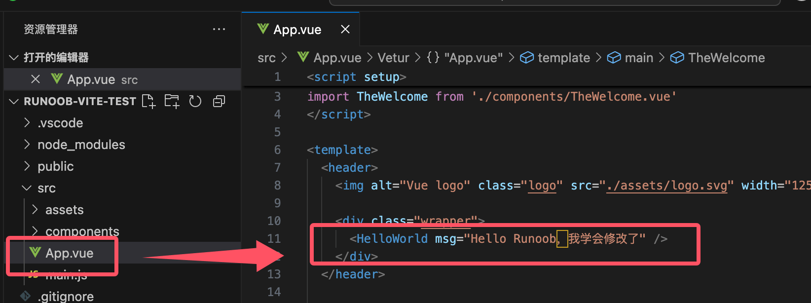 打开 src/App.vue 文件,修改代码并保存文件。