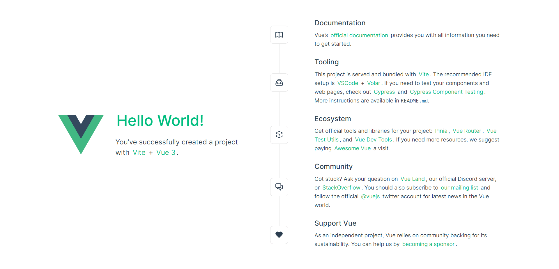 Vue.js - The Progressive JavaScript Framework > 请输入项目名称: … runoob-vue3-app > 是否使用 TypeScript 语法? … 否 / 是 > 是否启用 JSX 支持? … 否 / 是 > 是否引入 Vue Router 进行单页面应用开发? … 否 / 是 > 是否引入 Pinia 用于状态管理? … 否 / 是 > 是否引入 Vitest 用于单元测试? … 否 / 是 > 是否要引入一款端到端(End to End)测试工具? › 不需要 > 是否引入 ESLint 用于代码质量检测? › 否 正在初始化项目 /Users/tianqixin/runoob-vue3-app... 项目初始化完成,可执行以下命令: cd runoob-vue3-app npm install npm run dev