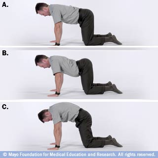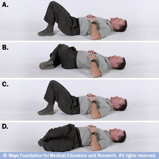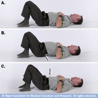 - 弓起背部,使下背部腾空。在不引起疼痛的前提下,尽可能地抬高保持5秒钟,然后放松。