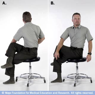 1.笔直地坐在凳子上,然后将右腿搁在左腿上。2.把左手靠在右腿上,同时扭动身体。3.保持10秒钟。4.换个方向做。
