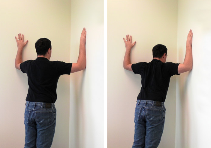 - 尽可能向墙倾斜的同时,保持身体的笔直。你会觉得在略低于脖子的地方以及肩膀和胸部的前面有一种舒展感。