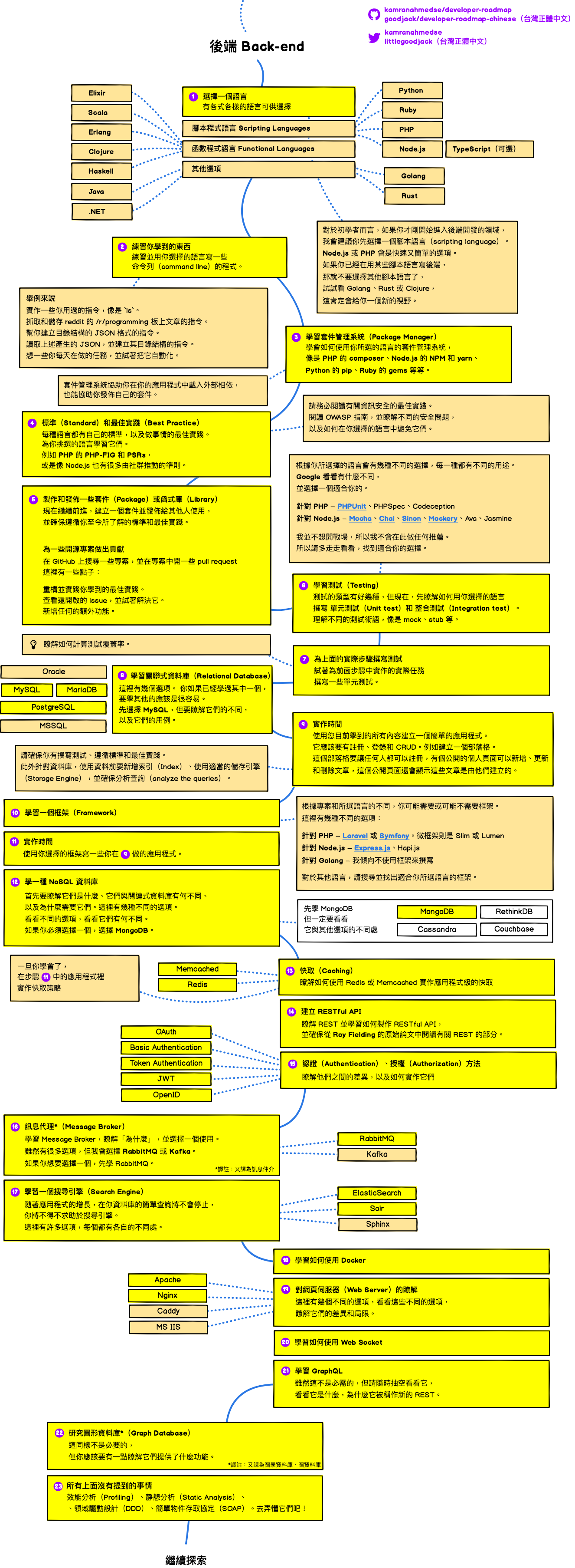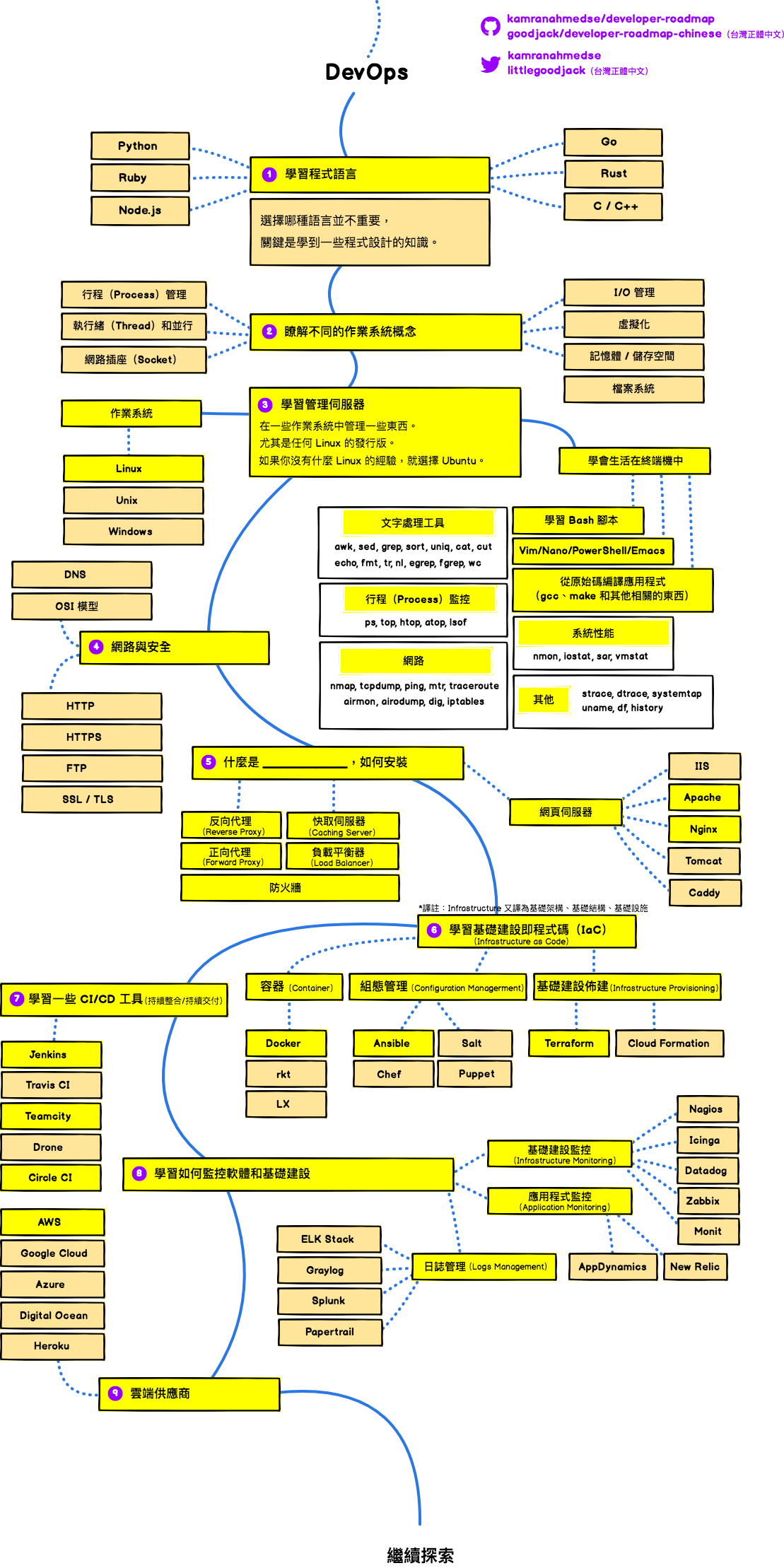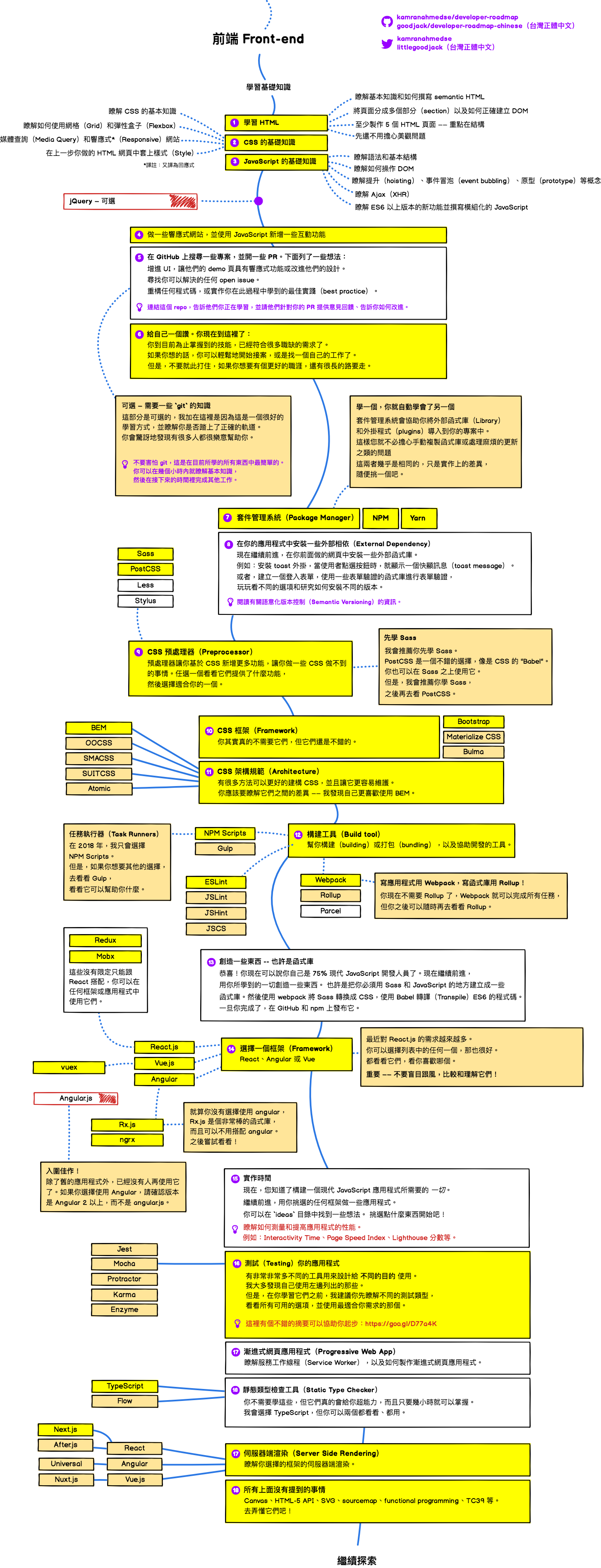 以下 Web 开发人员学习路线图是来自 Github developer-roadmap 项目,目前已经有繁体版翻译 developer-roadmap-chinese。