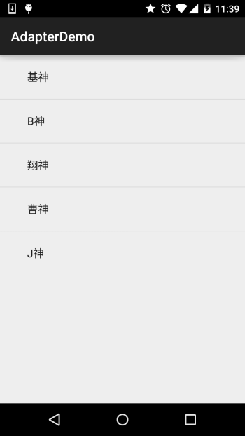 好的,多说无益,写代码最实际,接下来我们来用写几个简单的Adapter实例, 帮助我们了解Adapter给我们带来的便利,另外,因为Adapter需要结合ListView, GridView等等控件讲解,一些高级一点的用法我们都放在ListView那里讲! 这里就简单演示下效果,另外这里用到的控件是ListView,下一节就会讲解, 现在看不懂也没关系!