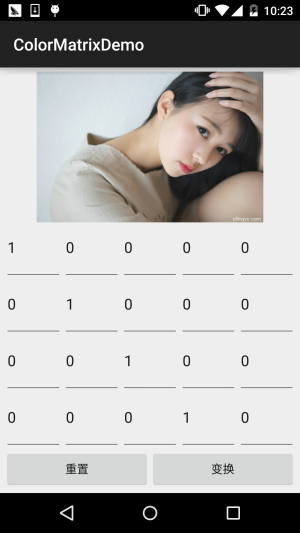 大概说的是:通过一个4 x 5的颜色矩阵来变换颜色,可以修改像素的饱和度,将YUV转换成RGB等! 而构造方法中的ColorMatrix就是颜色矩阵,也是我们学习的核心,下面听我一一道来!