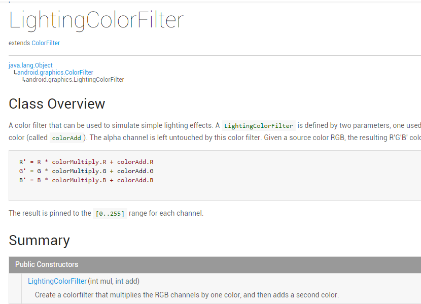 上一节中我们讲解了Android中Paint API中的ColorFilter(颜色过滤器)的第一个子类: ColorMatrixColorFilter(颜色矩阵颜色过滤器),相信又开阔了大家的Android图像处理视野, 而本节我们来研究它的第二个子类:LightingColorFilter(光照色彩颜色过滤器),先上一发 官方API文档:LightingColorFilter,文档里的东西也不多,关键的在这里: