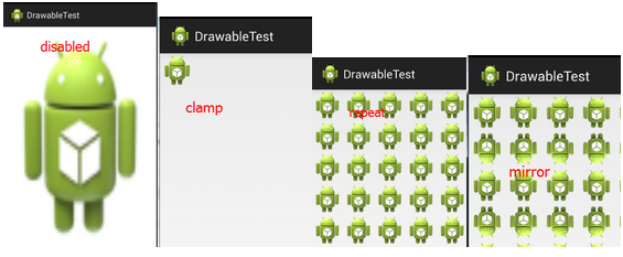 - tileMode:指定图片平铺填充容器的模式,设置这个的话,gravity属性会被忽略,有以下可选值: disabled(整个图案拉伸平铺),clamp(原图大小), repeat(平铺),mirror(镜像平铺)