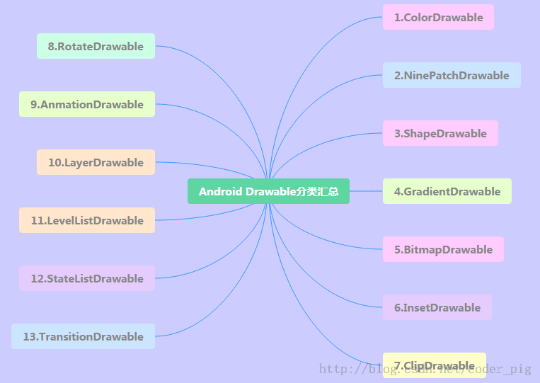 本节我们来把剩下的四种Drawable也学完,他们分别是: LayerDrawable,TransitionDrawable,LevelListDrawable和StateListDrawable, 依旧贴下13种Drawable的导图: