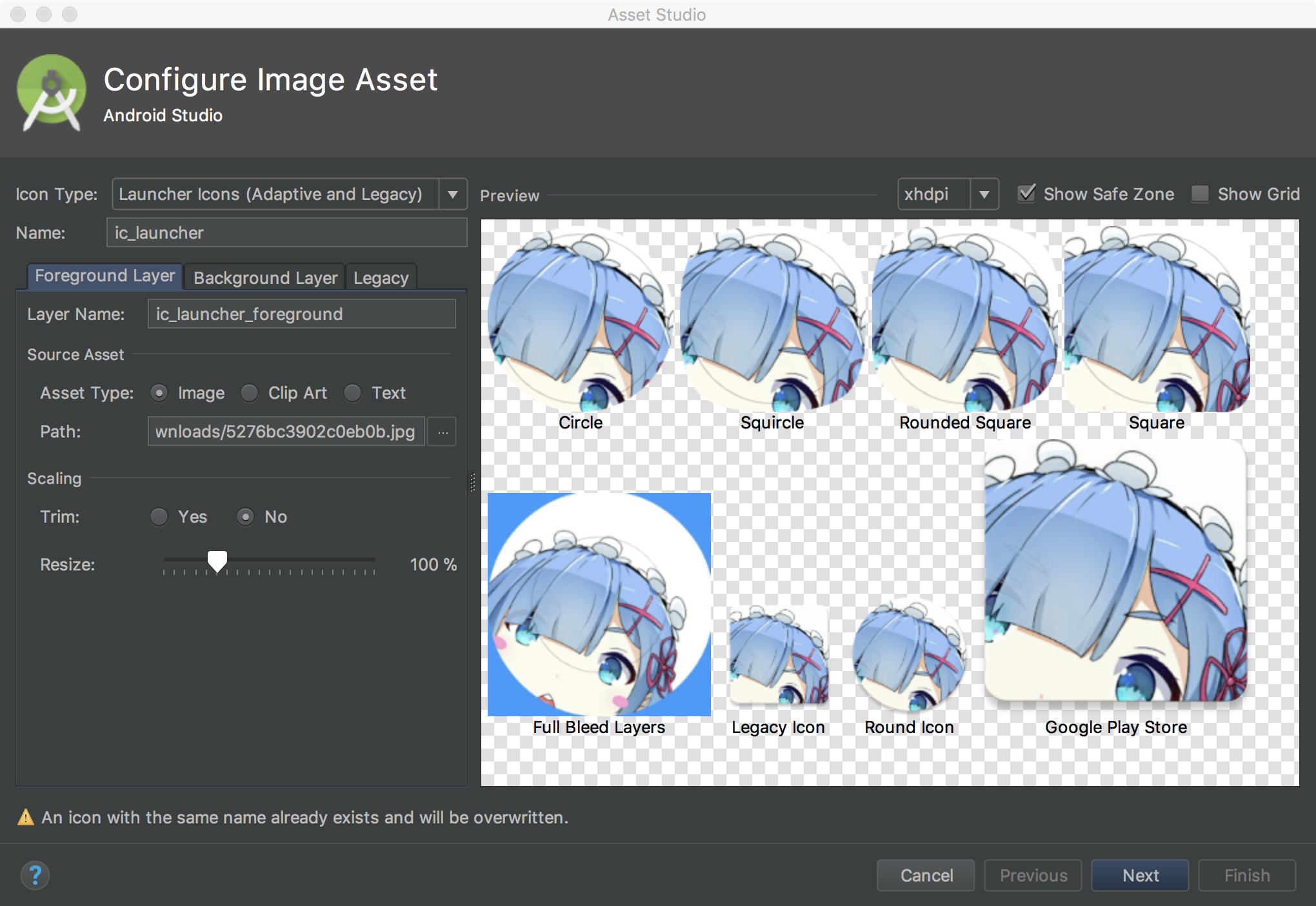 本来想着自己用Sketch做一枚的,摸索了10分钟不到就放弃了... 还是直接利用AS自带的图标生成工具一键生成算了,步骤如下: 右键drawable文件夹 -> new -> Image Asset,选择自己喜欢 的图片做图标,比如我最喜欢的过气女二蕾姆,然后Next,接着 的弹窗无脑下一步就好: