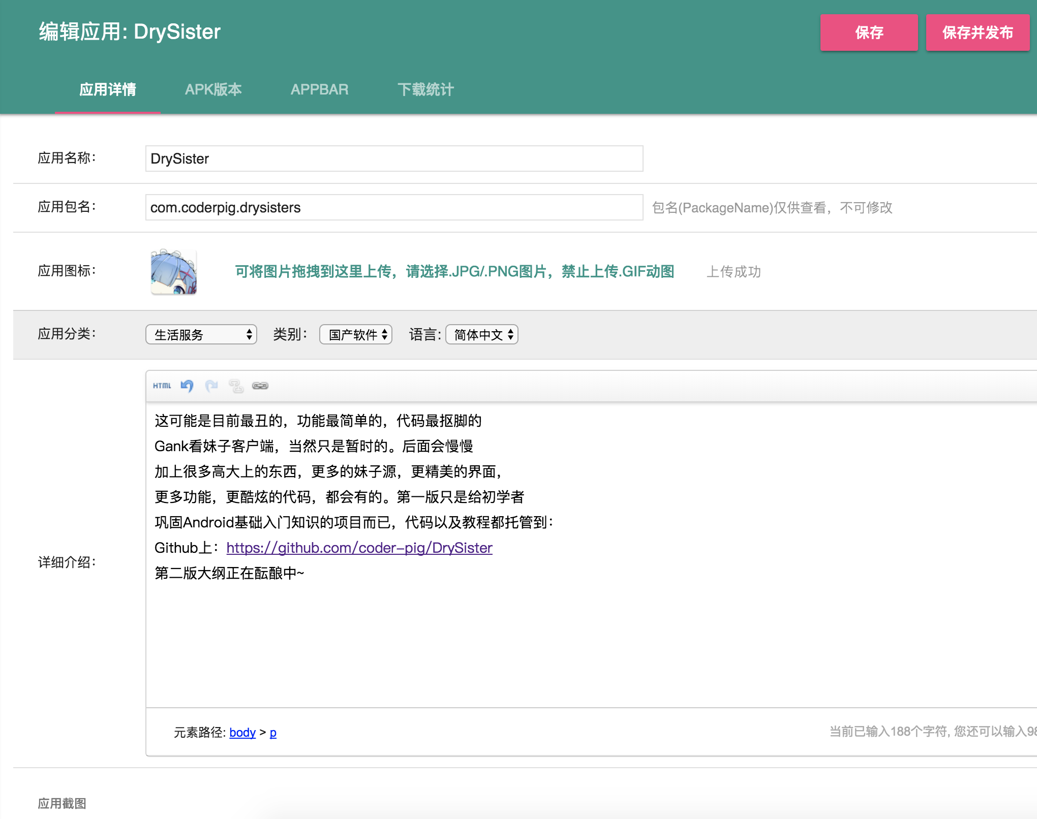 不要问我为什么是酷安市场,搞机的基佬基本都会混酷安的~ 发布我们的应用,然后填写相关描述信息,传应用截图; 接着点APK版本上传我们的APK,这里会对apk包名做校验, 我之前写错一直没发现,后面改了才可以;
