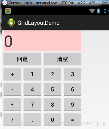 代码解析: 代码很简单,只是回退与清楚按钮横跨两列,而其他的都是直接添加的,默认每个组件都是 占一行一列,另外还有一点要注意的: 我们通过:android:layout_rowSpan与android:layout_columnSpan设置了组件横跨 多行或者多列的话,如果你要让组件填满横越过的行或列的话,需要添加下面这个属性: android:layout_gravity = "fill"!!!就像这个计算机显示数字的部分!