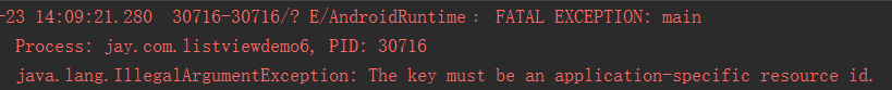 这里有个地方要注意的,convertView.setTag(R.id.Tag_APP,holder1);我们平时都直接 setTag(Object)的,这个是setTag的重载方法,参数是一个唯一的key以及后面的一个对象! 唯一!!!我一开始直接把TYPE_BOOK作为第一个参数,然后就报下面这个错误: