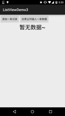 可以运行,运行后发现我们的页面并没有任何的数据,白茫茫的一片,这样的用户体验并不好, 我们可以通过调用ListView的一个setEmptyView(View)的方法,当ListView数据为空的时候, 显示一个对应的View,另外发现这个方法很奇葩,动态添加的View,竟然无效,只能在ListView 所在的布局文件中添加当ListView无数据时,想显示的View,另外用这个setEmptyView设置后的 View,加载的时候竟然不会显示出来,好灵异....比如这里的是没有数据时显示一个没有数据 的TextView,部分代码如下: