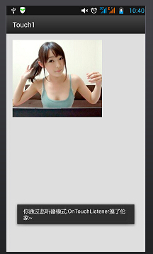 Toast.makeText(getApplicationContext(),"你通过监听器模式:OnTouchListener摸了伦家~",Toast.LENGTH_LONG).show();