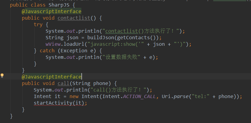 嘿嘿,看完上面的,我们知道在Android4.2后,只有添加 @JavascriptInterface 声明的Java方法才可以被JavaScript调用,于是乎我们为之前的两个方法加上@JavascriptInterface