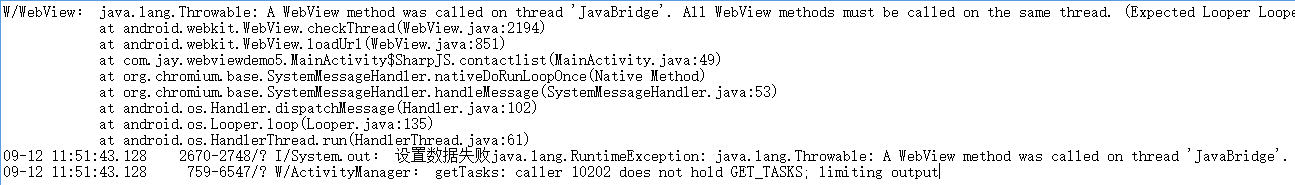 大概的意思就是:所有的WebView方法都应该在同一个线程程中调用,而这里的contactlist方法却在 JavaBridge线程中被调用了!所以我们要要把contactlist里的东东写到同一个线程中,比如一种解决 方法,就是下面这种: