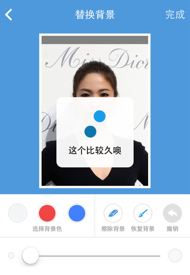 现在主流手机屏幕的比例为16:9,即78;2寸证件照比例为1.34,这些数字接近什么呢?伟大的黄金分割比例呀!但是从背景替换页面可以看出上部整个蓝色区与下面白色的菜单栏区明显比例失调,经过测算比例为2.52。较好的方式是UI设计下部菜单栏可以浮动显示,或者让图片能够大图展示,给人以强力的视觉冲击感。再看UX,「智能证件照」利用人脸识别算法自动给图片换背景,这肯定需要时间处理,但是根据Compuware的一项的调查显示,5秒是用户能够容忍的最长等待网页加载时间,50%的用户超过这个时间段会放弃,这对于一个APP运行处理速度也可以作为参考。