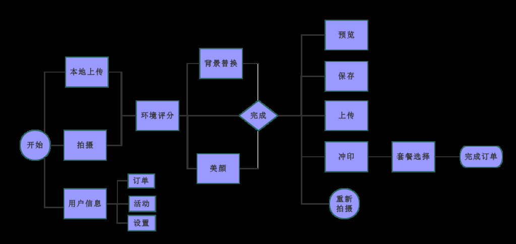 「智能证件照」的逻辑框架整体看起来均匀对称,一个APP结构越稳定,那么在其上的功能延展、添砖加瓦也就很自然。从最开始的拍摄页面到最后完成证件照制作,整个过程几乎没有冗余的操作,也就使得用户操作顺畅,像喝水一样一气喝成。