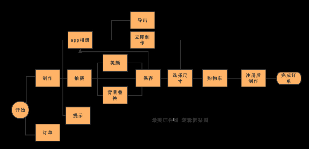 「最美证件照」结构整体看来也挺流利顺畅,但是仔细看时,却犯了很多APP设计的毛病:残缺、关节打缠。首先看最开始的页面:制作与订单,用户使用最多的是制作拍摄功能,最下面的订单用户几乎不会去使用,用户点击下去也会发现走不通又立马返回,这种使用频次的巨大对比,也就造成了订单这一枝像缺了腿一样,完全没用,不仅造成了冗余,结构失衡,同时显露出了覆在结构之上的功能薄弱。所以这部分,删!最开始就直接进入拍摄页面。接着看最上方突出的APP相册与导出这块,仔细分析可以看出,「最美证件照」没有本地照片上传美颜处理功能,它自身所带的相册是基于用户拍摄照片后内部保存的照片,这里也就出现了逻辑的混乱,当处女用户使用这个功能时会以为这是一个bug。