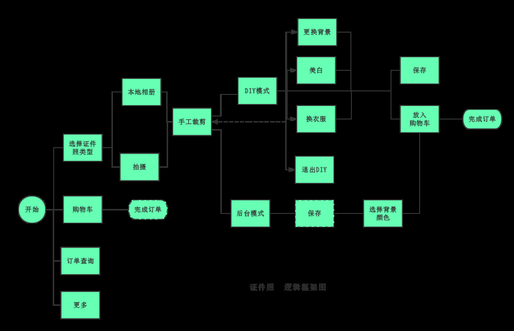 整体上我们一眼就可以发现「证件照」结构庞杂,看起来填充了很多内容,实际体验会发现很多功能都很薄弱,这犯了虚胖空洞的毛病。乔老爷子说过:"Simple can be harder than complex."对于复杂,我们要删的东西还有很多。接着我们看手工裁剪那一块的虚线箭头,当用户美白、换背景、换衣处理不佳后退返回时都会跳转到手工裁剪这一模块,而不是有序的上一步返回。这可以看出其程序中goto跳转语句遭到了滥用(注:goto语句用的不好,很容易像鸠摩智学艺不成,反落得个经脉逆行),这是技术水平不足的表现,也是用户最后迫于无奈直接被引导流入后台人工PS模式的设计思想源头。我们再看一点APP结构设计与实际功能展现所存在的矛盾问题:最开始它是从选择证件照类型这条路走的,不同证件照有不同标准要求,然而在后面更换背景时,它里面自由提供了各种背景色,如果用户没有相关概念,造成的结果将是证件照不达要求。这是在后期肉相设计中,忘记了初心,逆骨生长,埋下了致病基因。