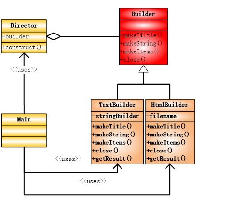 关于Builder模式,我们一定要分清和模板方法的区别,其实就是到底谁承担了"监工"的责任,在模板方法中父类承担了这个责任,而在Builder中,有另外一个专门的类来完成这样的操作,这样做的好处是类的隔离,比如说在Main中,用户根本就不知道有Builder这个抽象类,同样的Director这个监工的根本就不管到底是哪一个实现类,因为任何一个都会被转换为父类,然后进行处理(面向抽象编程的思想),因此很好的实现了隔离,同样的这样设计的好处是复用了,隔离的越好复用起来就越方便,我们完全可以思考,假如还有另外一个监工,使用了不同的construct方法来组装这些复杂的事件,那么对于原来的代码我们不用做任何的修改,只用增加这样的一个监工类,然后定义好相应的方法就好了,之后再Main中使用,这样的一种思想使得我们不用修改源代码,复用(Builder以及其子类)就很方便了,同样的,如果想增加一个新的Builder的子类,只要照着父类的方法进行填充,再加上自己的方法就好了,完全不用修改代码,这也是一种复用,因此这种复用(组件)的思想在设计模式中随处可见,本质就是高内聚低耦合,组件开发,尽量不修改原来的代码,有可扩展性,理解了这一点,我们再看看模板方法,责任全放在了父类里,如果责任需要改变,则必须要修改父类中的责任方法了,这样就修改了原来的代码,不利于复用,这也是两者的本质区别。