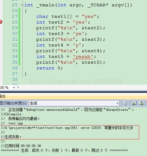 根据实验结果可以看到字符超过 4 个字节,超出了 int 型存储能力,编译器报错,提示常量字符太多。这样可以有效提醒给程序猿同学,有可能存在符号输入错误,但是没有超过 int 型存储能力时照单全收,没有任何提示,存在着符号误用的隐患,以后程序出现问题调试会相当麻烦。