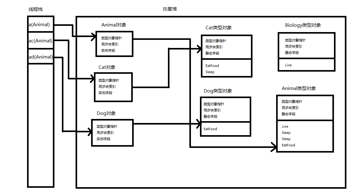 现在回到刚才的例子,Main 函数时程序的入口,在 JIT 编译器将 Main 函数编译为本地CPU指定时,发现该方法引用了 Biology、Animal、Cat、Dog这几个类,所以 CLR 会创建几个实例来表示这几个类型本身,我们把它称之为"类型对象"。该对象包含了类中的静态字段,以及包含类中所有方法的方法表,还包含了托管堆中所有对象都要有的两个额外的成员——类型对象指针(Type Object Point)和同步块索引(sync Block Index)。