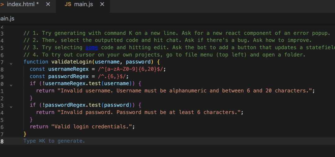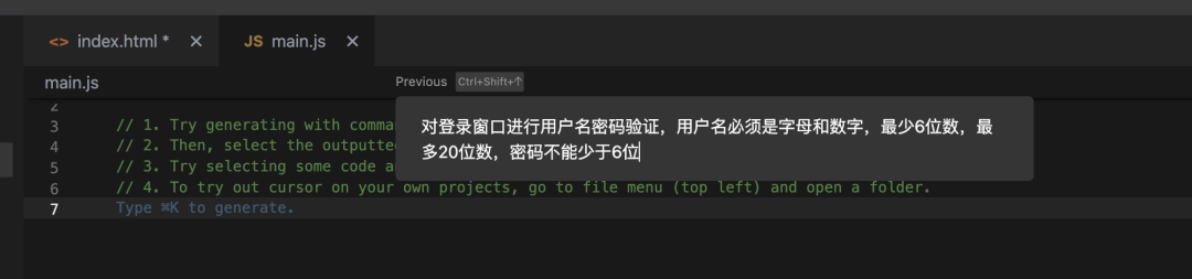 然后我们再创建一个 main.js 文件,让编辑器写一些对用户输入的验证: